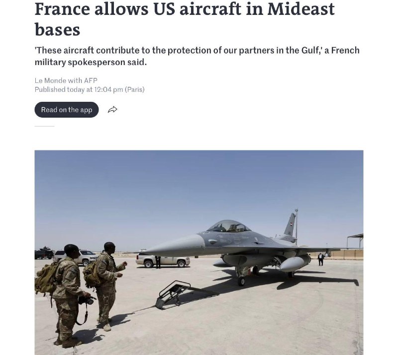 Франція тепер дозволила Сполученим Штатам Америки використовувати свої військові бази на Близькому Сході. Це рішення прийнято на фоні загострення напруженості в регіоні, зокрема – спроби Ірану атакувати британську базу RAF Akrotiri на Кіпрі, де розміщуються літаки, що беруть участь в операціях на Близькому Сході. Згідно з інформацією від військових, ракети, випущені з Ірану, були перехоплені системами протиповітряної оборони.