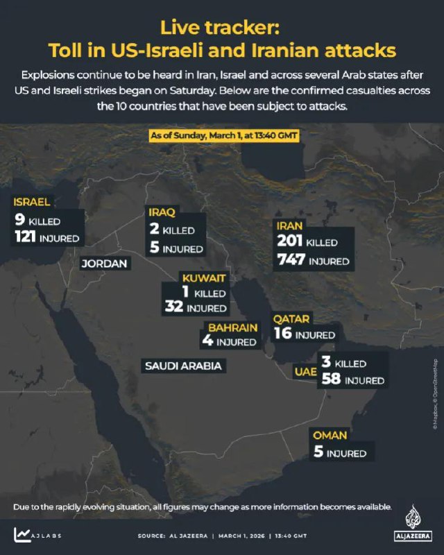 По даним Центрального командування Збройних сил США, з американської сторони загибли троє військовослужбовців, ще п’ятеро отримали поранення. Тим часом катарський телеканал Al Jazeera показав інфографіку з останніми даними про загиблих та постраждалих з початку операції проти Ірану.