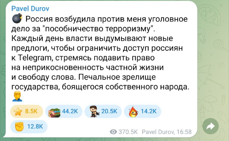 “россия возбудила против меня уголовное дело за помощь терроризму, чтобы ограничить доступ россиян к Telegram”, – Павел Дуров.