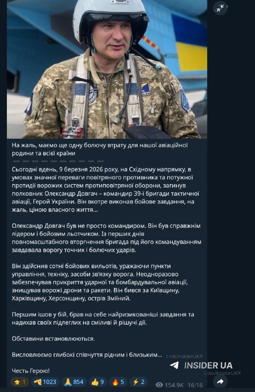 Сьогодні на Східному напрямку загинув пілот Олександр Довгач, командир 39-ї бригади тактичної авіації. Він виконував бойове завдання, захищаючи нашу країну. Ця втрата є великою tragedia для всієї авіаційної спільноти та України в цілому. Вічна пам’ять Герою!